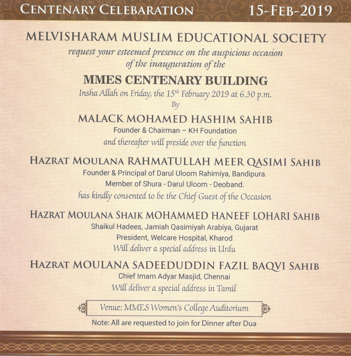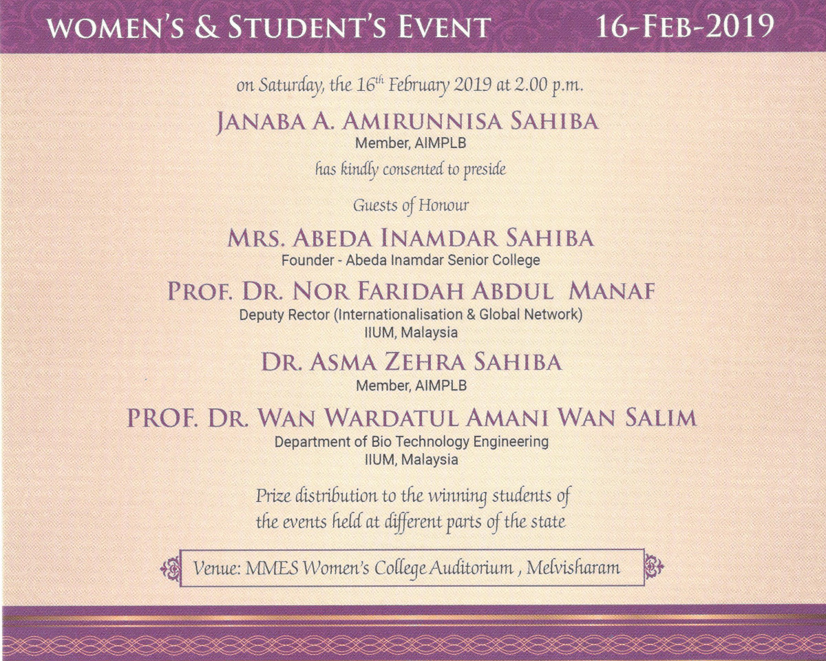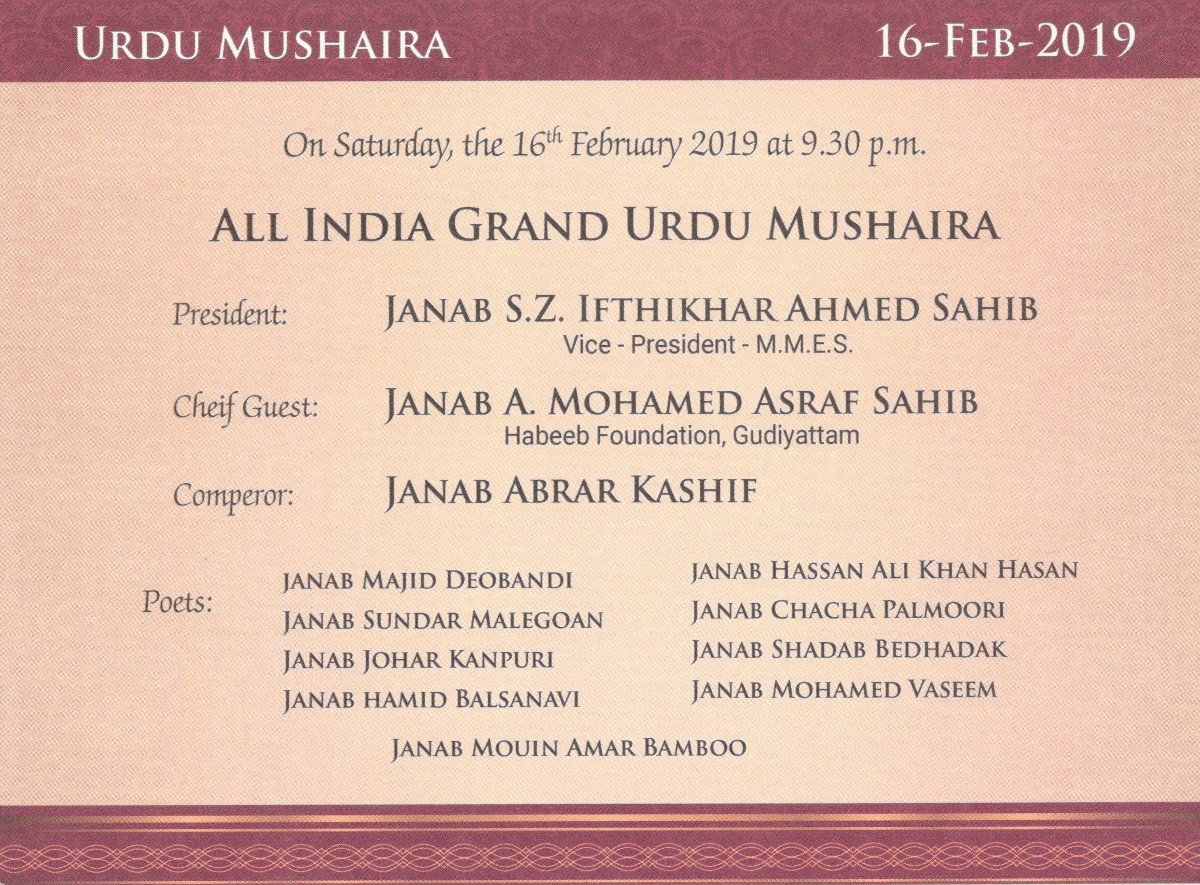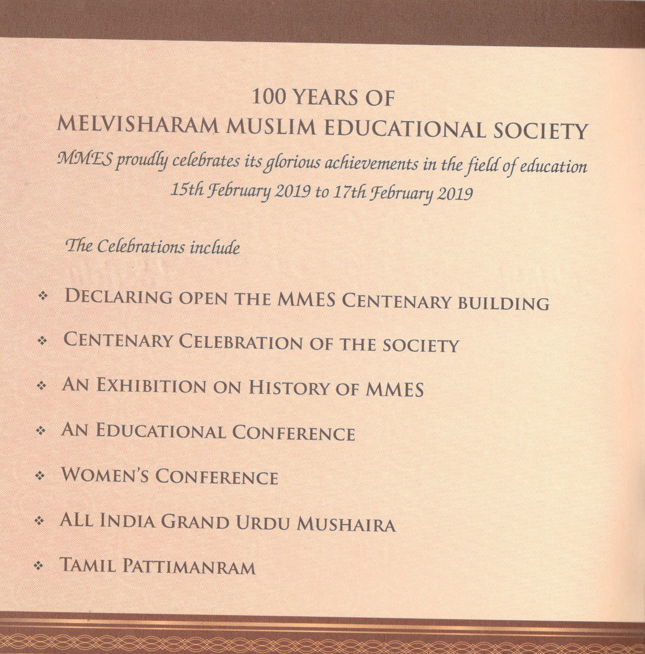 Declaring Open the MMES Centenary Building Centenary Celebration of the Society An Exhibition on History of MMES An Educational Conference Women’s Conference All India Grand Urdu Mushaira Tamil Pattimanram