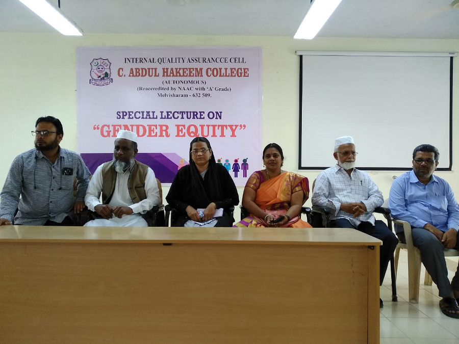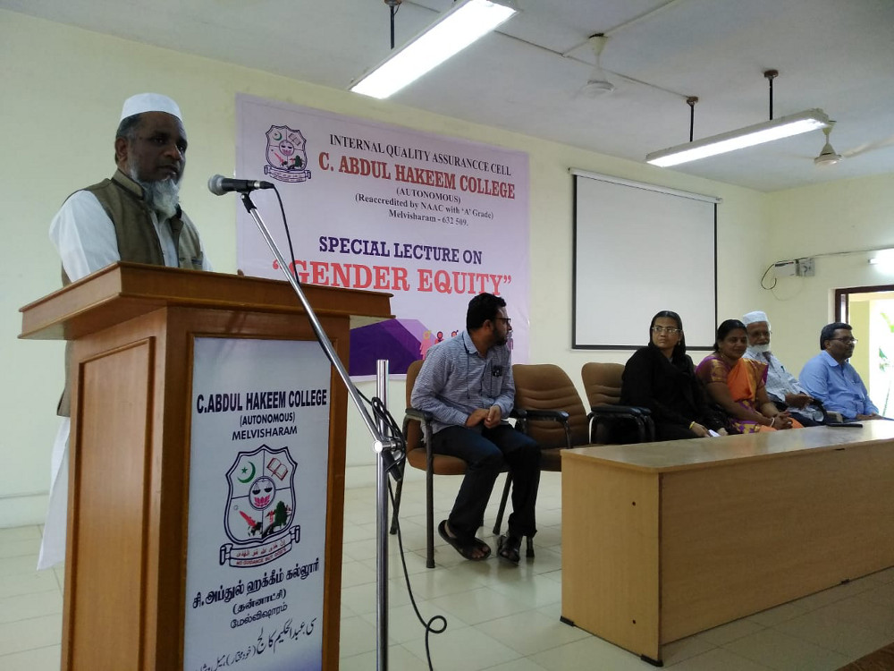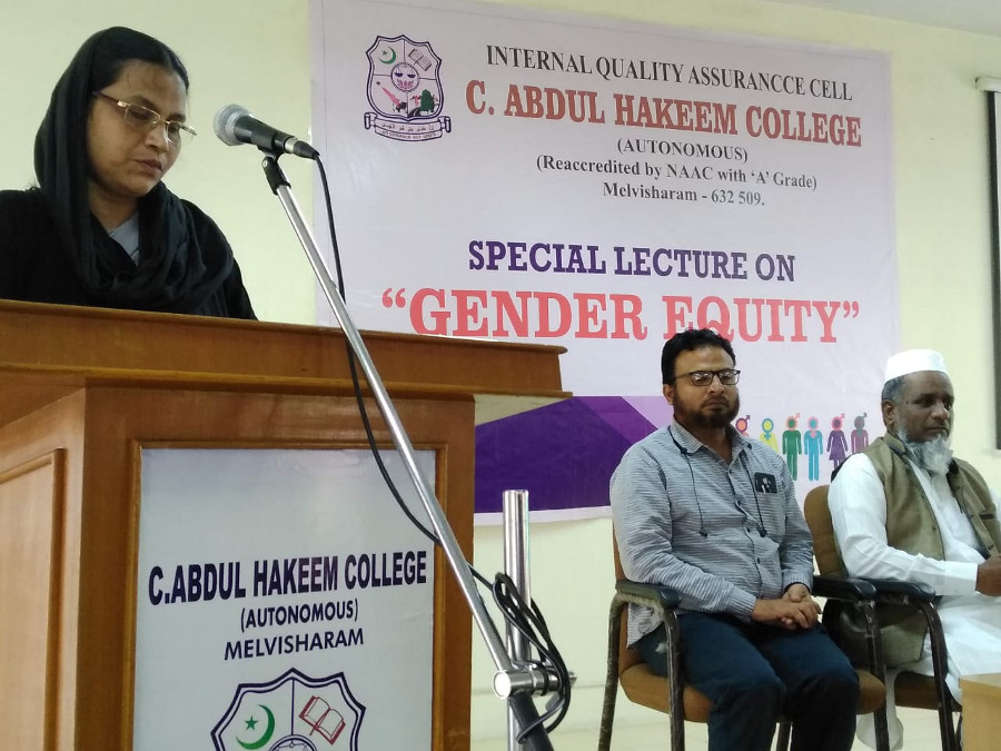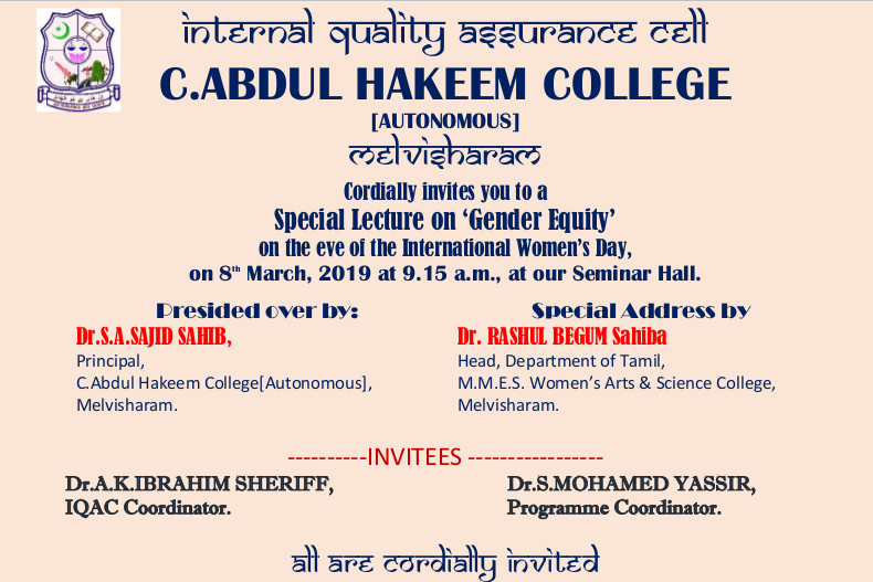 Gender Equity – International Women’s Day 2019 Published on March 1, 2019March 6, 2020 by cahcollege A Special Lecture on “Gender Equity” on the eve of International Women’s Day On 8th March 2019 at 9:15 a.m. at Seminar Hall Special Address by Dr. Rashul Begum Sahiba Head, Department of Tamil, M.M.E.S. Women’s Arts & Science College Melvisharam Presided Over by Dr. S.A. Sajid Principal C. Abdul Hakeem College (Autonomous) Melvisharam Dr. A.K. Ibrahim Sheriff IQAC Coordinator Dr. S. Mohamed Yassir Programme Coordinator