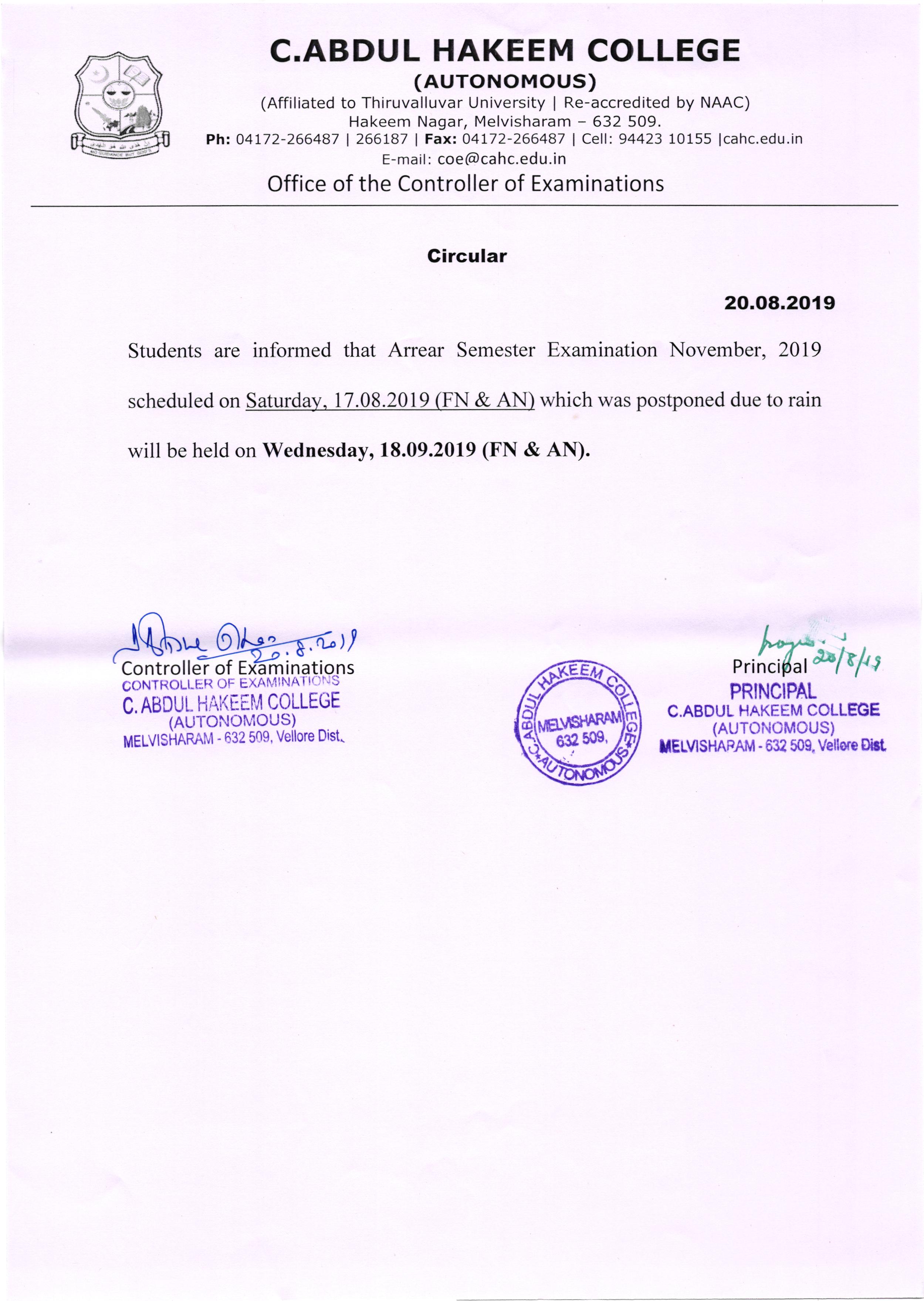 Arrears Semester Examinations on 17-08-2019 (FN & AN)is postponed will be held on 18-09-2019 Published on August 19, 2019August 22, 2019 by Controller Of Examination CAHC Students are informed that Arrear Semester Examination November, 2019 scheduled on Saturday, 17.08.2019 (FN & AN) which was postponed due to rain will be held on Wednesday, 18.09.2019 (FN & AN). Click here to view/Download Share this… Buffer Facebook Threads Whatsapp Twitter