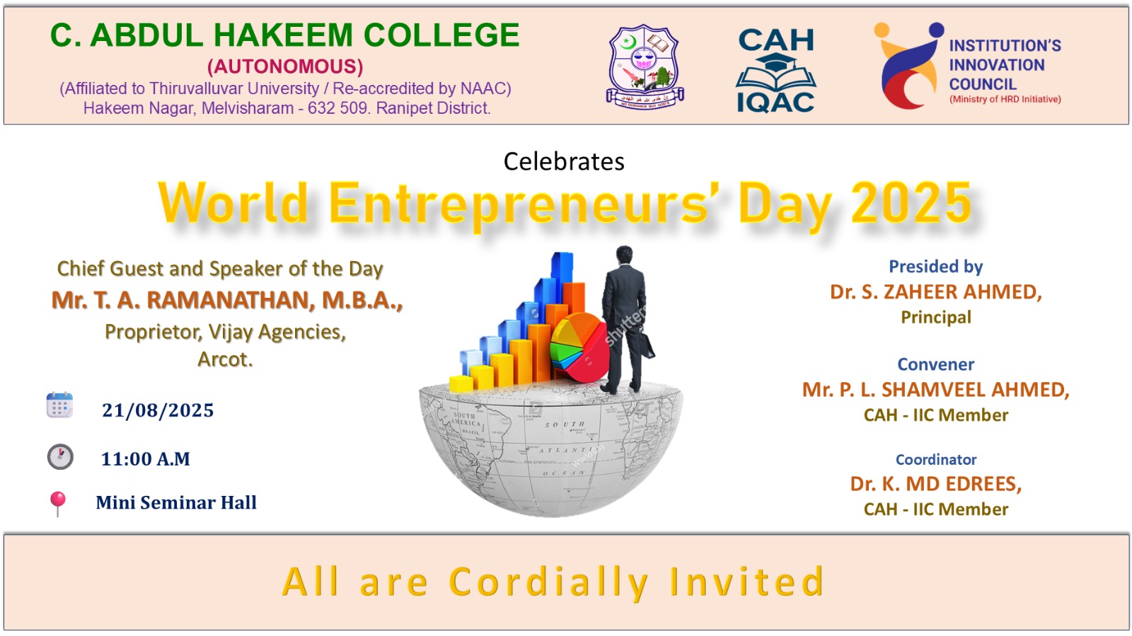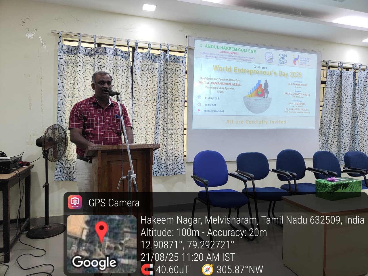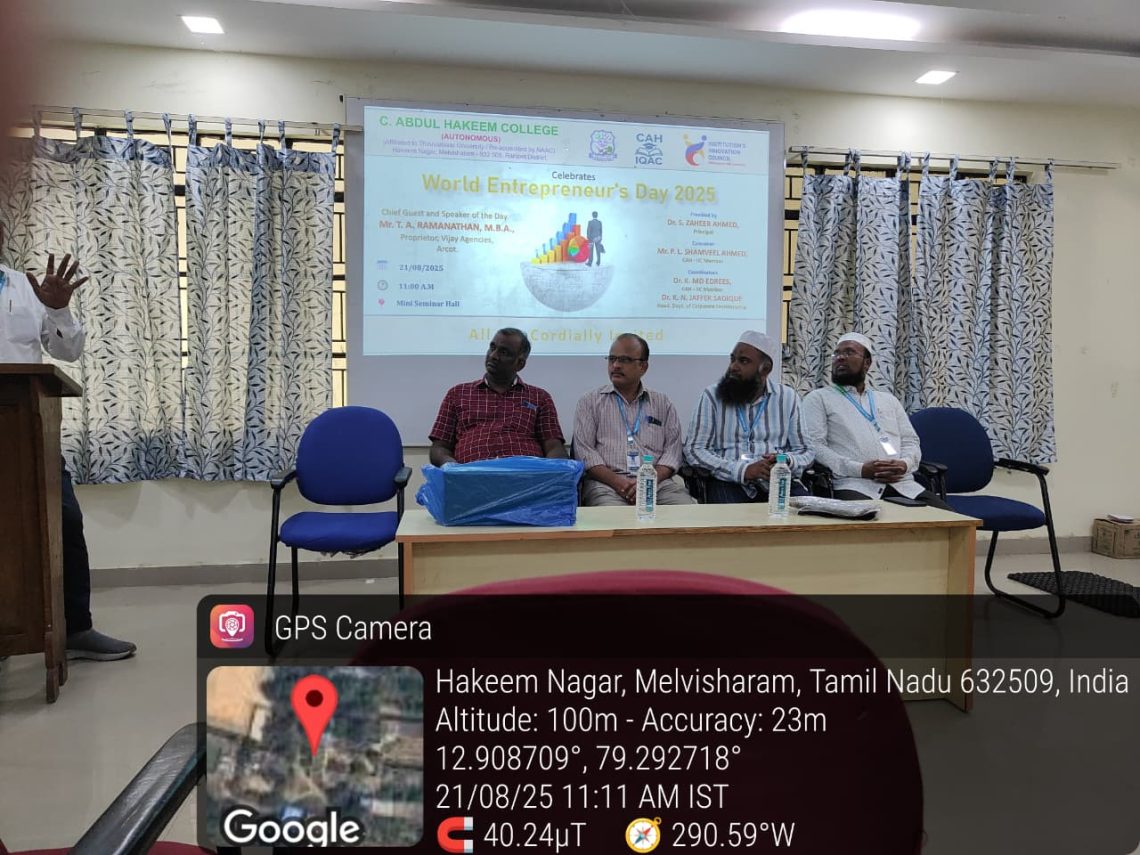C. Abdul Hakeem College (Autonomous), Melvisharam, organized a special program to celebrate World Entrepreneurs’ Day 2025 on 21st August 2025 at the Mini Seminar Hall.