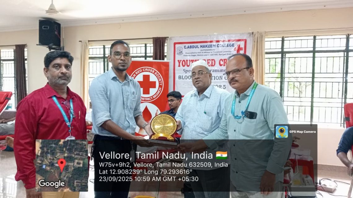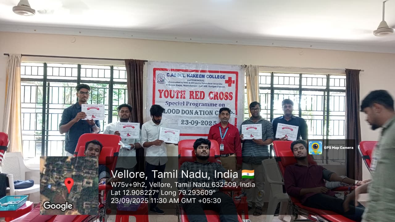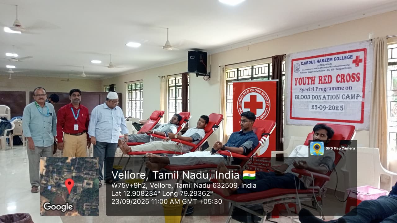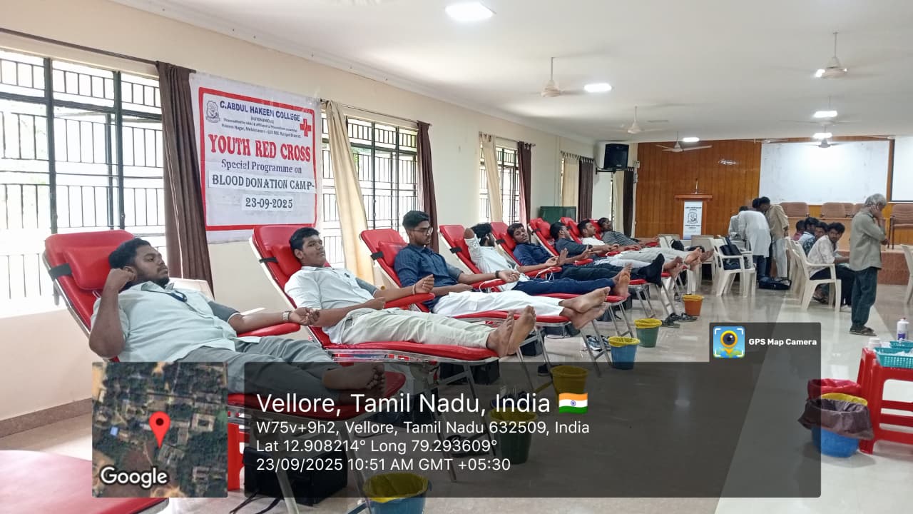 On September 23, 2025, the Youth Red Cross unit of C. Abdul Hakeem College (Autonomous), Melvisharam, organized a blood donation camp at the Seminar Hall. Dr. S. Zaheer Ahmed, the college Principal, inaugurated the event.