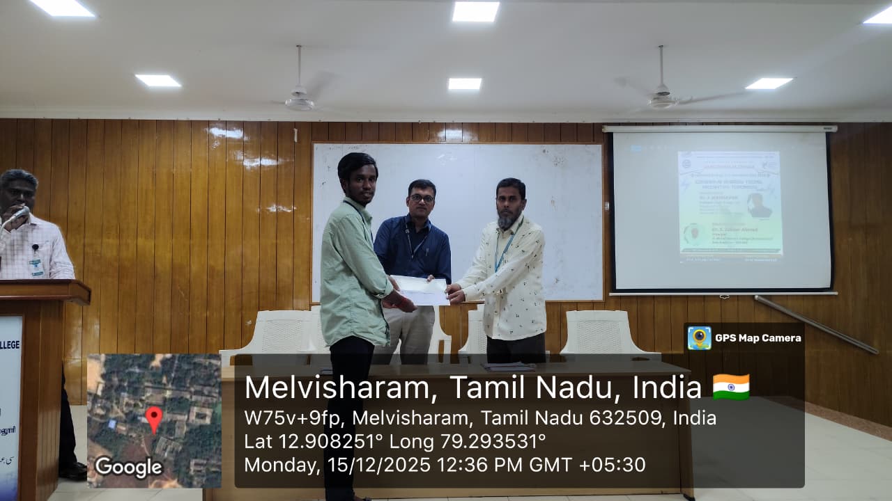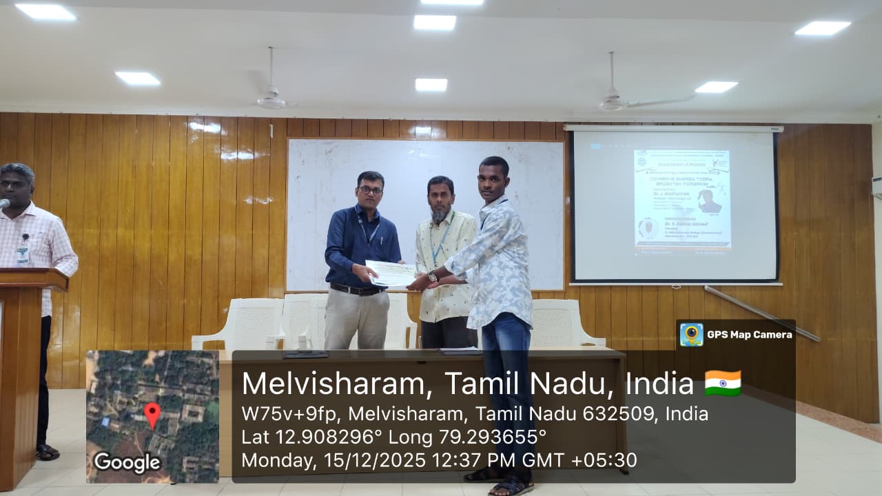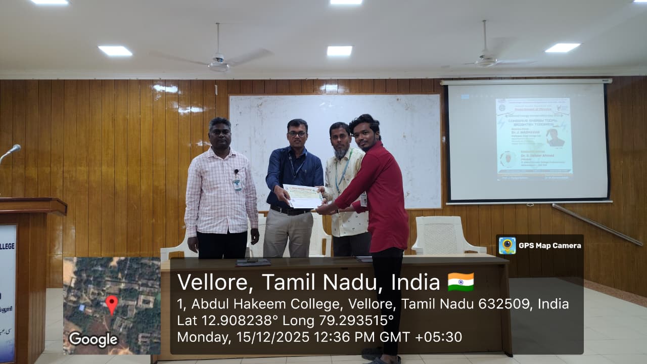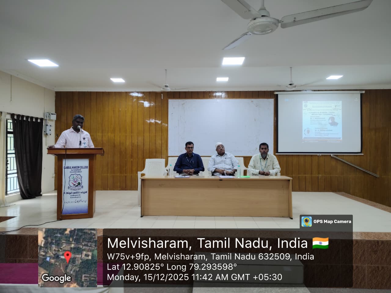 The Department of Physics, in association with the Internal Quality Assurance Cell (IQAC), C. Abdul Hakeem College (Autonomous), Melvisharam, organizes the National Energy Conservation Day programme at the Seminar Hall. The programme features a special lecture by Dr. J. Madhavan, Professor, Solar Energy Lab, Department of Chemistry, Thiruvalluvar University, Vellore, highlighting the importance of energy conservation and sustainable practices for a greener future. The event is presided over by Dr. S. Zaheer Ahmed, Principal, C. Abdul Hakeem College, who delivers an inspiring presidential address emphasizing responsible energy usage and environmental stewardship. Faculty members, students, and staff actively participate in the programme, reinforcing the theme “Conserve Energy Today, Brighten Tomorrow.”