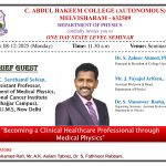 The Department of Physics, C. Abdul Hakeem College (Autonomous), Melvisharam, organized a One Day State Level Seminar on “Becoming a Clinical Healthcare Professional through Medical Physics” on 8th December 2025 (Monday) at the Seminar Hall.
