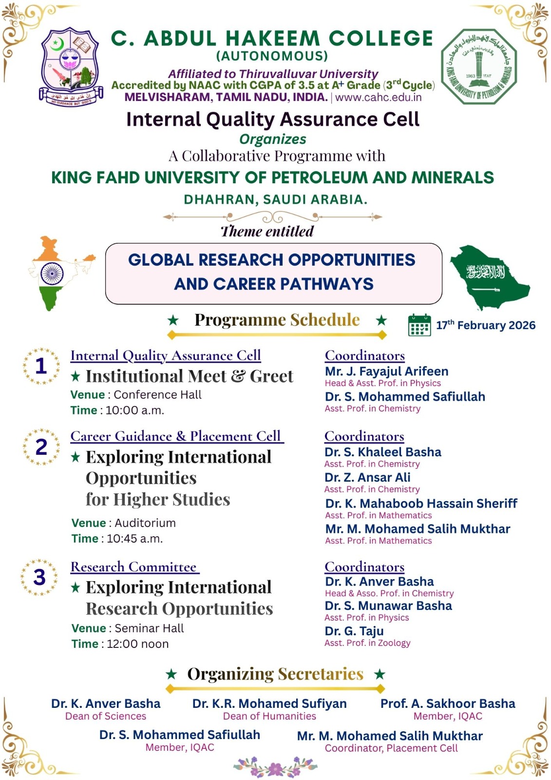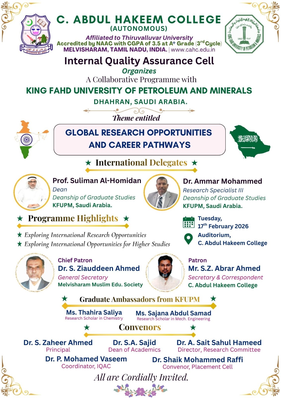 The Internal Quality Assurance Cell (IQAC) of C. Abdul Hakeem College (Autonomous), Melvisharam, organized a prestigious international collaborative programme in association with King Fahd University of Petroleum and Minerals (KFUPM), Dhahran, Saudi Arabia, on 17th February 2026.