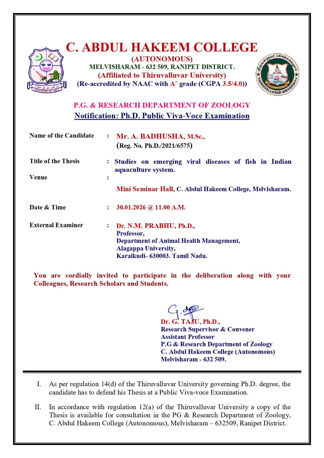 Ph.D. Public Viva-voce Examination of Mr A BADHUSHA under the guidance of Dr G TAJU Department of Zoology 30.01.2026 Published on February 3, 2026February 3, 2026 by faiz