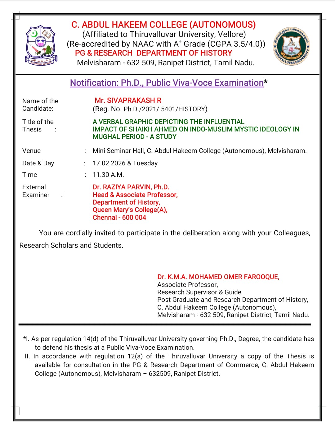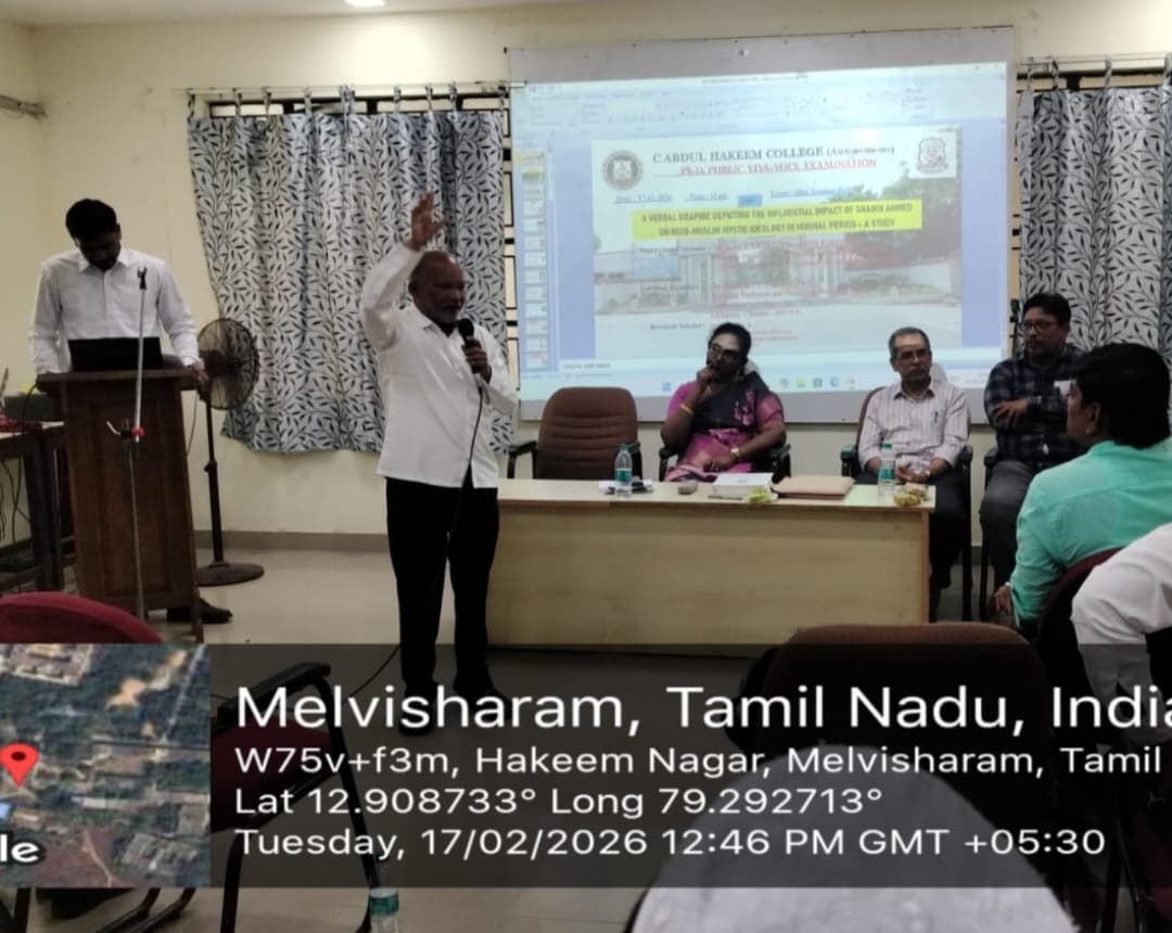 The PG & Research Department of History, C. Abdul Hakeem College (Autonomous), Melvisharam, announces the Public Viva-Voce Examination of the following Ph.D. scholar: