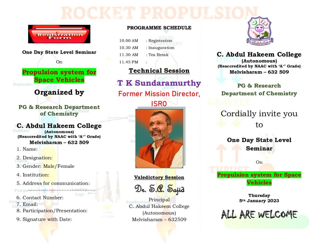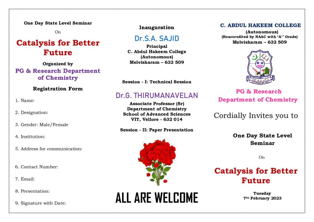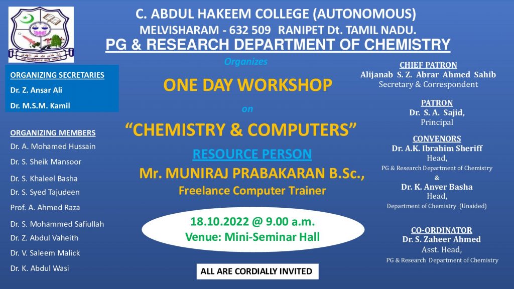 The department of Chemistry of C. Abdul Hakeem College was started as one of the earliest department in the year 1967. B.Sc. and M.Sc. programmes were started in 1970 and 1984 respectively. The department was elevated into a research department in the year 1992 by offering M.Phil. (Full-Time and Part-Time) and Ph.D. programme was started in the year 2010. The B.Sc. Chemistry course was started in the evening college from the year 2015.