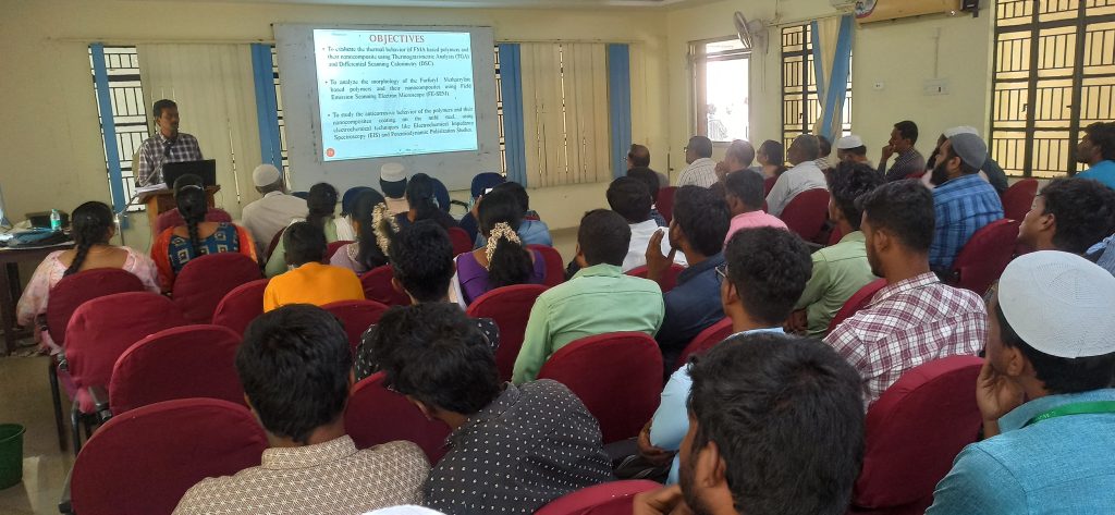 The department has excellent infrastructure and well qualified faculty members, also engaged in active research in several areas of chemistry. Major research projects funded by UGC, DRDO & TNSCST are being carried out successfully by the staff members. Both faculty members and research scholars have published many research papers in national and international seminars/conferences/workshops. Government of India has accorded the department the status of DST-FIST sponsored department with instrumental facilities such as FT-IR, UV-Visible spectrophotometer, Electrochemical Workstations (AUTOLAB) and Fluorescent spectroscopy. The department is well equipped with Electrochemical Work Station, Particle Size Analyzer, Spin Coater, Geiger Muller Counter, Probe Sonicator and Polishing Machine, etc. The chemistry department is striving towards providing quality education and research training to the students.