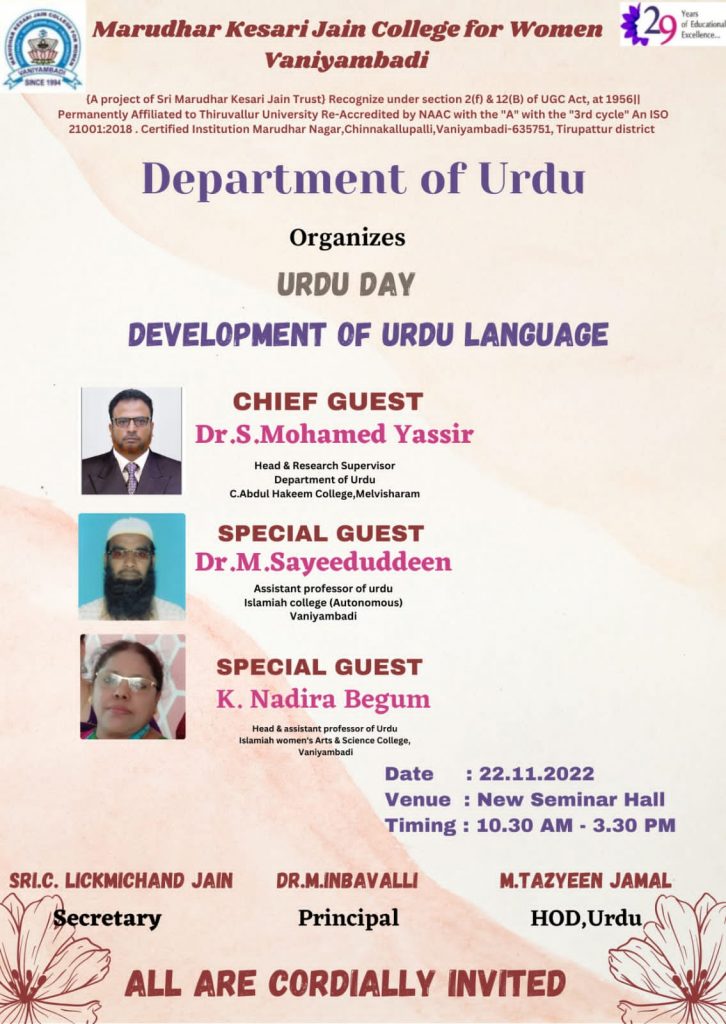 The Dept. is Currently headed by Dr. S. Mohamed Yassir, who is the first Guide-Supervisor at the Collegiate level for the Scholars of Ph.D., Degree in the whole of Tamil Nadu. The Dept. of Urdu is contributing its maximum for the success of all centralized Functions on the Campus, for maintenance of orderly behaviour of students and for the progress of the college in Academics and Research.