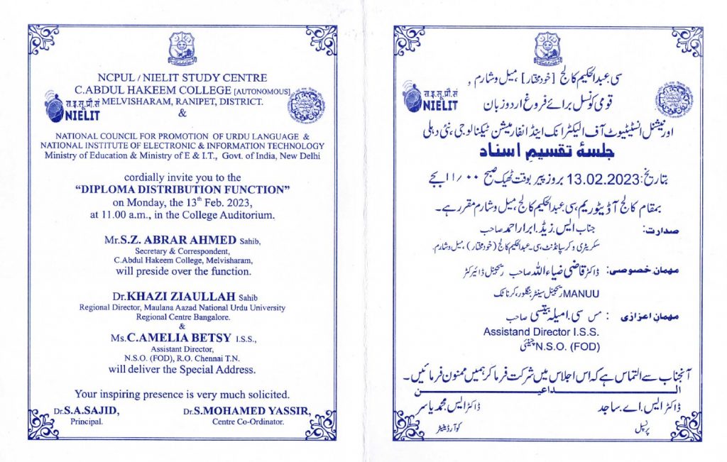 Apart from its regular classwork of teaching Urdu as a Foundation Course for students of I U.G and II U.G. courses, the Department has evolved into a well-known training Centre to groom students to qualify for the Certificate and Diploma Courses in Functional Urdu, Arabic and Persian. These Courses are sponsored by the National Council for Promotion of Urdu Language, Govt. of India, New Delhi and the Course Contents are paving room for Non-Urdu, Non-Persian and Non-Arabic Knowing students to learn these languages that have acquired the reputation as some of the widely spoken Languages across the globe. Each of these Courses is handled by Two Part-Time teachers with the financial assistance extended by the National Council for Promotion of Urdu Language.